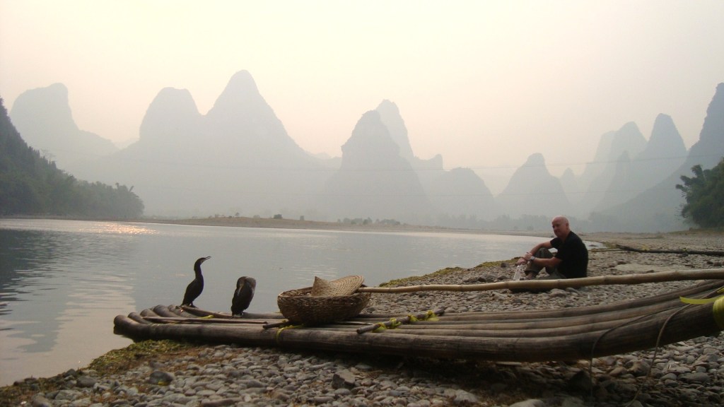 Since seeing the show, and visiting Xingping, we have seen a number of bamboo rafts carrying fishermen and their birds doing their stuff in a much more private manner. It is quite amazing. The birds have a small constriction around their necks and are trained to free swim the river, catch fish and bring them back to the raft for the fisherman to disgorge the birds and deposit the catch in a basket. Every 6/7 fish the master allows them to eat thus ensuring their loyalty. It’s very, very clever and fantastic to see man and beast working together so well. A bit like a shepherd and his trusty mutt!