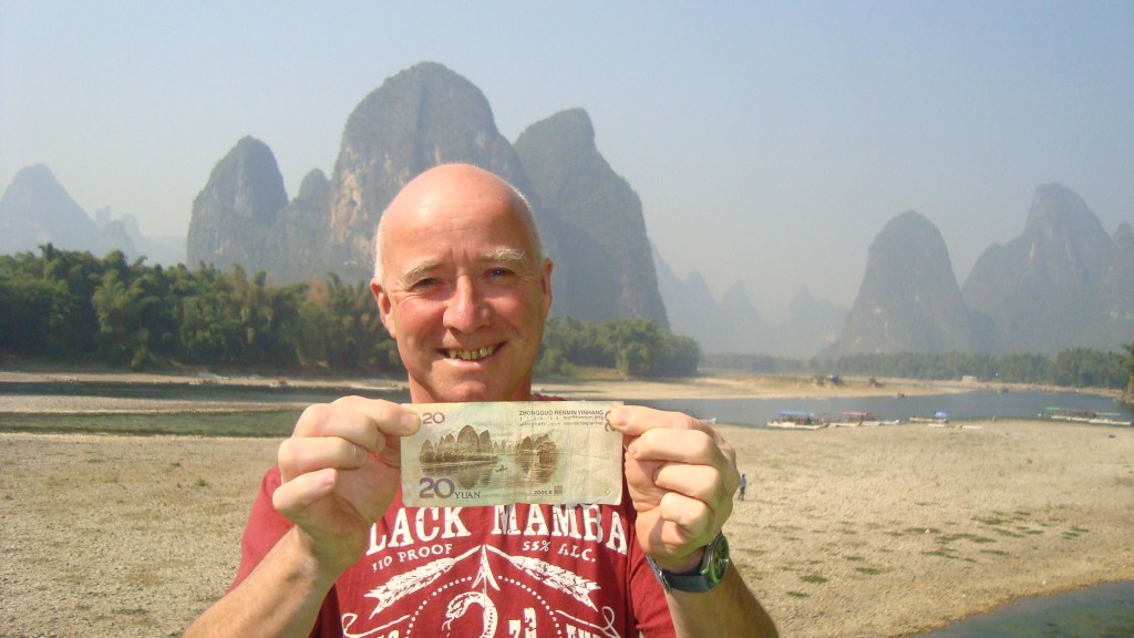 Xingping is quite revered in China as on the back of the 20Yuan note there is a picture of one of the groups of limestone karsts that dominate this area of China. Here we are doing what all the Chinese tourists do…pose with their note (value £2)!!