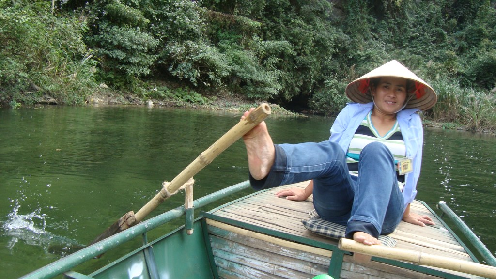 Getting to the grottoes was a little more challenging. Trips were available from hotels and agencies but as the number of tourists is low, there were no cheap group tours, just private hire car at $25. Having checked out the map we decided we could walk it let alone get a taxi for less than $25. It was about 8kms (5 miles) and we managed to get a local taxi that cost us $6 return trip! The grottoes were fantastic, and the ticket price of 100,000VND (about £3.30) included a 2.5 hour boat ride along the river in, out and through the caves in the massive limestone karsts. We went through about 9 or 10 grottoes, some up to 100m long, and some of them so low we had to lie flat on our backs in the boat. Our boat lady sometimes rowed with her hands and sometimes she somehow managed to row with her feet……pretty smart!