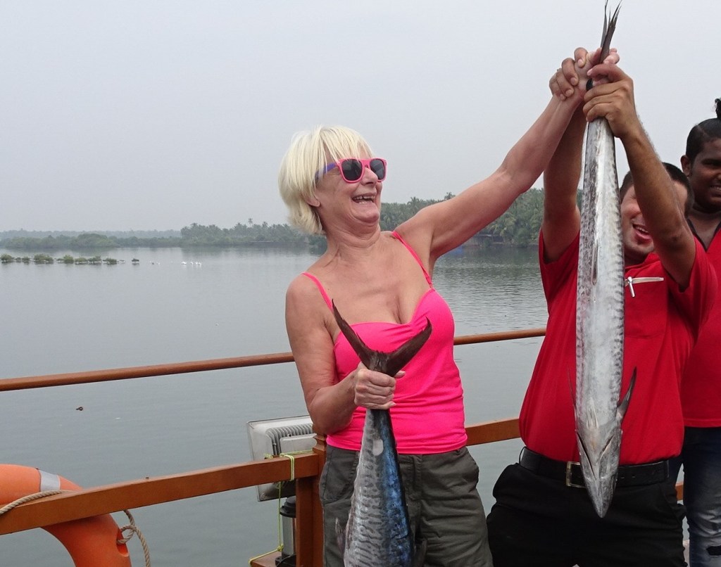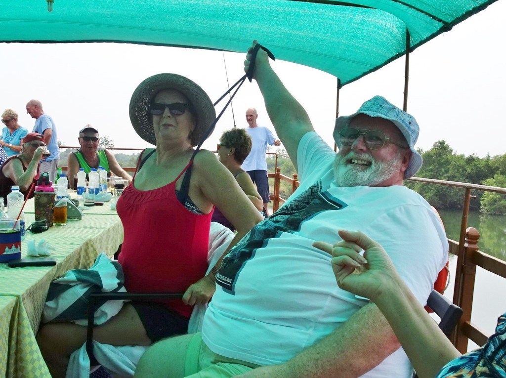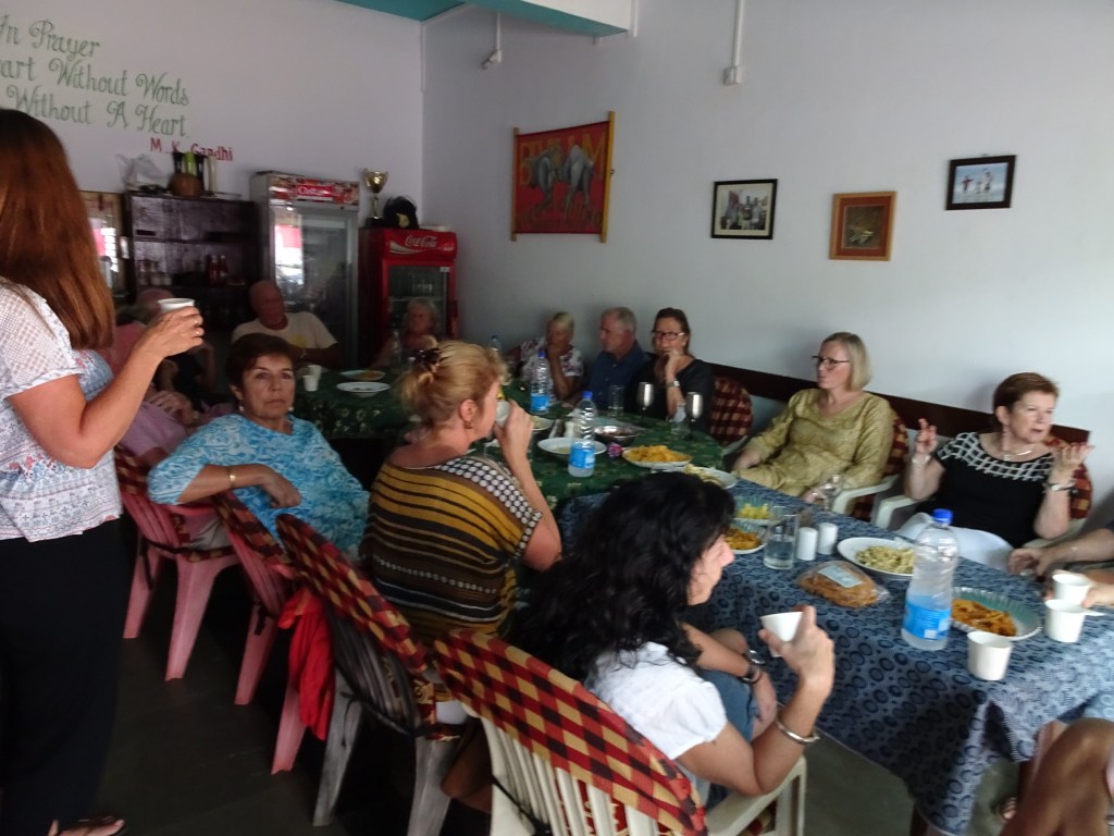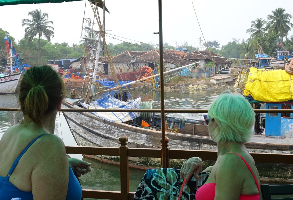 This year we’ve rented a 3 bedroom town house with balconies at the front overlooking the swimming pool and at the back the paddies. It’s in the same development we’ve stayed in for the last 2 years so we’re beginning to get to know more and more people. The advantage is we can have people to stay and Neil’s sister June and best friend Barbs were due to arrive just a few days after us. We got on with planning the rest of their trip and working out how they could pay for things without a wad of cash in their purses. We took them on a boat trip to see dolphins and eat gorgeous garlic prawns and kingfish plus plenty of G&T. They enjoyed time on the beach and Barbs found time to apply some much needed first aid to Neil who slipped in the shower and managed to slash his wrist on the edge of some tiles. Then they were off for 6 nights on their own for their trip on the overnight train to Kerala including the backwaters and tea estates. They had a ball, ate too much and came back with lots of goodies like strawberry jam for us to devour.