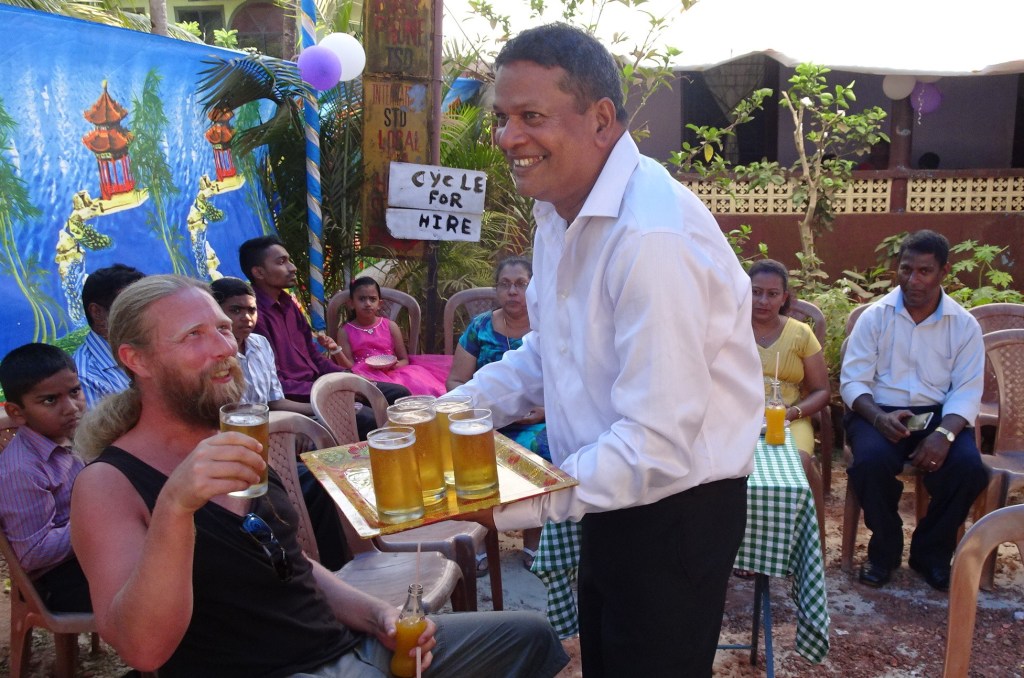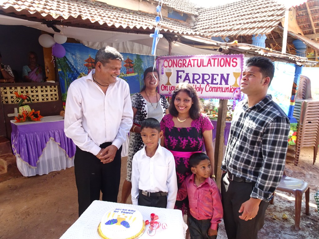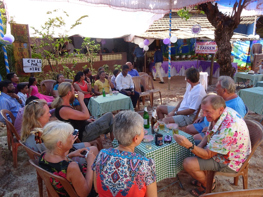 We were also invited along to Francis’ son’s First Communion Party. This was held in the small yard in front of his house where a small canopy had been erected to provide some shade. Functions like this are held throughout the village as many of the children all had their First Communion on the same day. The family parties start with a delicious plate of starters and drinks flow. There is time for chit chat and finally the cake is cut and the buffet is served. We are used to people chatting and socialising for a long while afterwards however, the Goan way is to sit almost in silence and then wolf down the buffet and clear off! Our table of foreigners who frequent Pescador had a great afternoon enjoying the delicious food. It was also a novelty to see Francis dressed in smart trousers and a shirt.