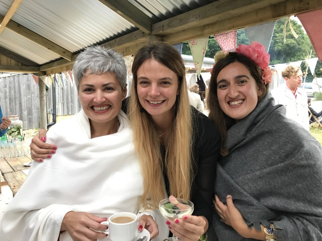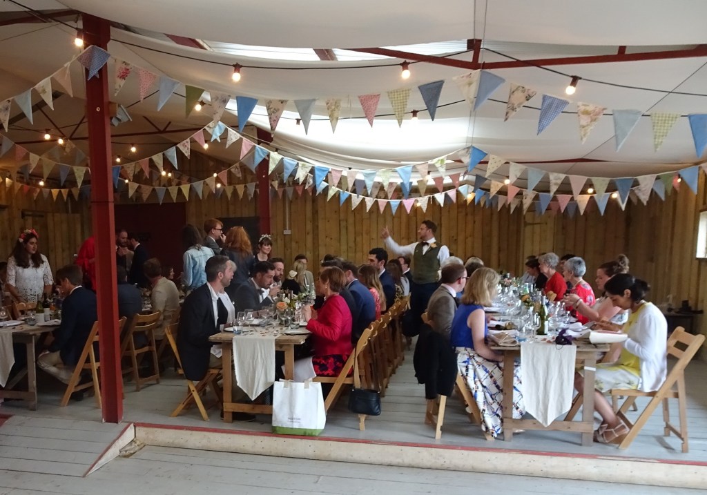 Friday arrived and it was time to head to the farm. Our first job was to collect the wine from Freddy’s sister who lives in Eastbourne. Then, having loaded the white and the bubbly into the fridge we set about helping Alex, Freddy, Lawrie and Jackie with the wedding venue. Bunting was strung up, lights draped in the trees, table runners were cut, family photos stuck on walls, glasses arranged, and other helpers greeted. Guests came from Osaka, Hong Kong, New York, Prague, Germany, Spain and, of course, all over the UK.