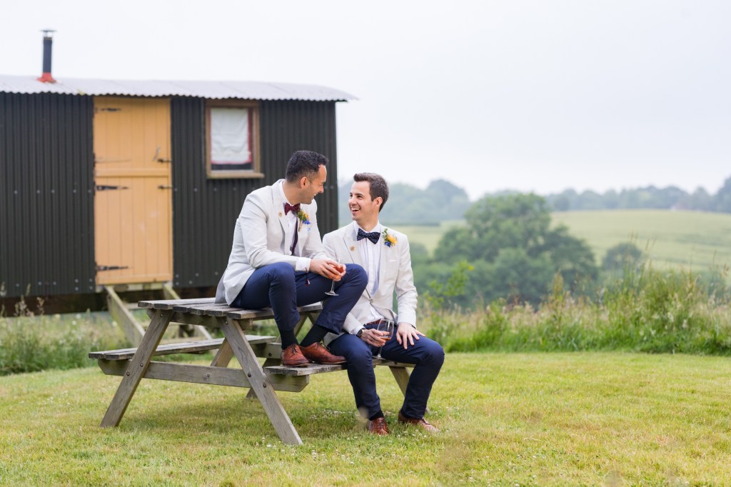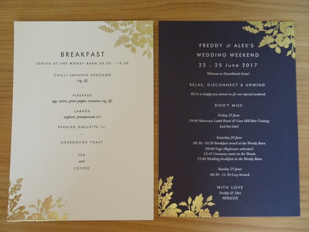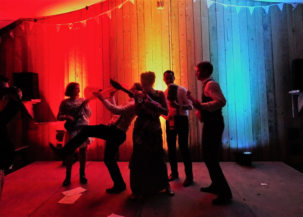 Alex’s best man Lawrie is an events manager so he was able to keep us on schedule. Mr Bouncy Castle arrived followed by Mrs Deckchairs. Tables and chairs were set out in the barn, fairy lights strung to guide the glampers to the camping field and LED uplighters that change colour to light the trees near the hot tub. Nothing was left to chance with blankets provided in case the evenings got cold, umbrellas in case it rained and plenty of wood for the campfire. To keep the 100 guests amused over the weekend there were games including table tennis, croquet, a bouncy castle, inflatable instruments for air guitar/sax and microphone for the wedding party and a giant jenga. For early risers and those that couldn’t sleep there was a yoga session early on Saturday morning in one of the fields.