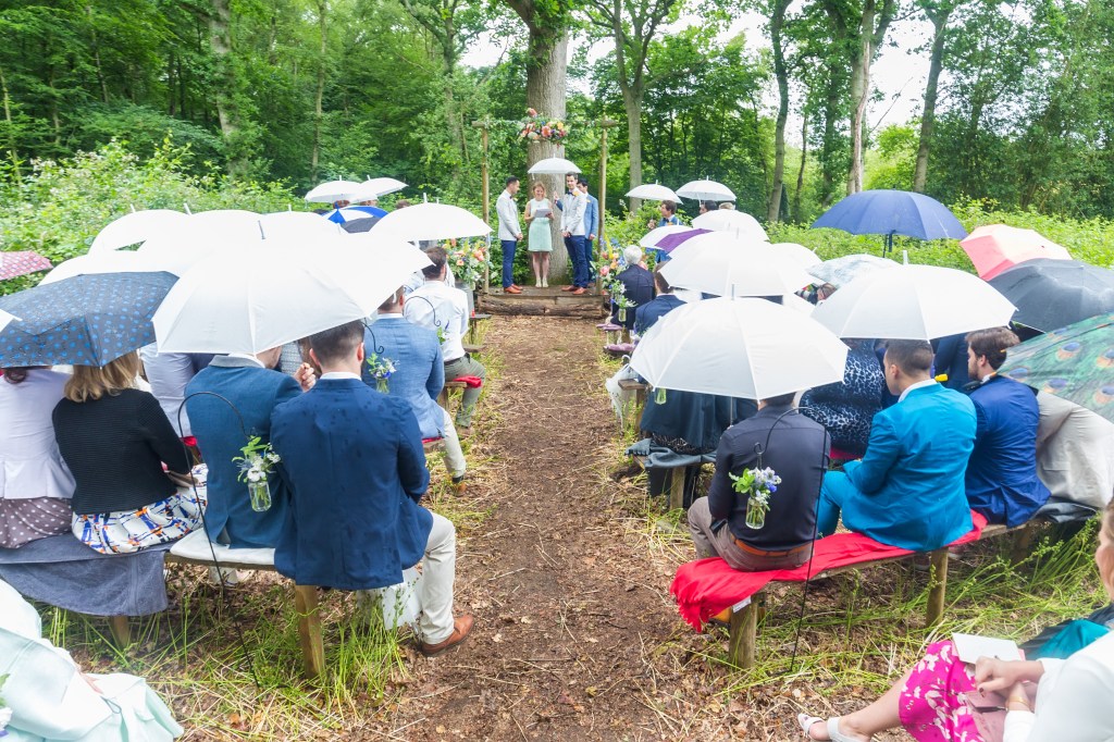 We woke on Saturday morning to grey skies, which was OK as the forecast was cloudy, but soon after breakfast the rain started, light at first, but then it got heavier. With 10 minutes to go, and no message that plans had changed, we decided to head for the glade. It was a bit of a walk, and Neil decided he would drive Cheryl in her heels down the lane, along with the Japanese girls who were wearing kimonos. The glade was beautiful despite the drizzle and the drips from the trees. Guests assembled, put towels on the soggy benches and put up their white umbrellas.
