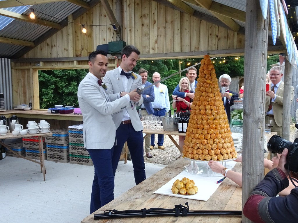 The rain stopped, it was still grey and chilly, but that really didn’t matter. The Illustrated Chef, plus staff, did a wonderful job with the food. The speeches were long, and there were a lot of them, but, they were moving and entertaining. Instead of a traditional cake the boys opted for a ‘croquembouche’ which is a French desert consisting of choux pastry balls filled with flavoured cream piled into a cone and bound with threads of caramel. You don’t ‘cut the cake’, you wallop the top off with a samurai sword!