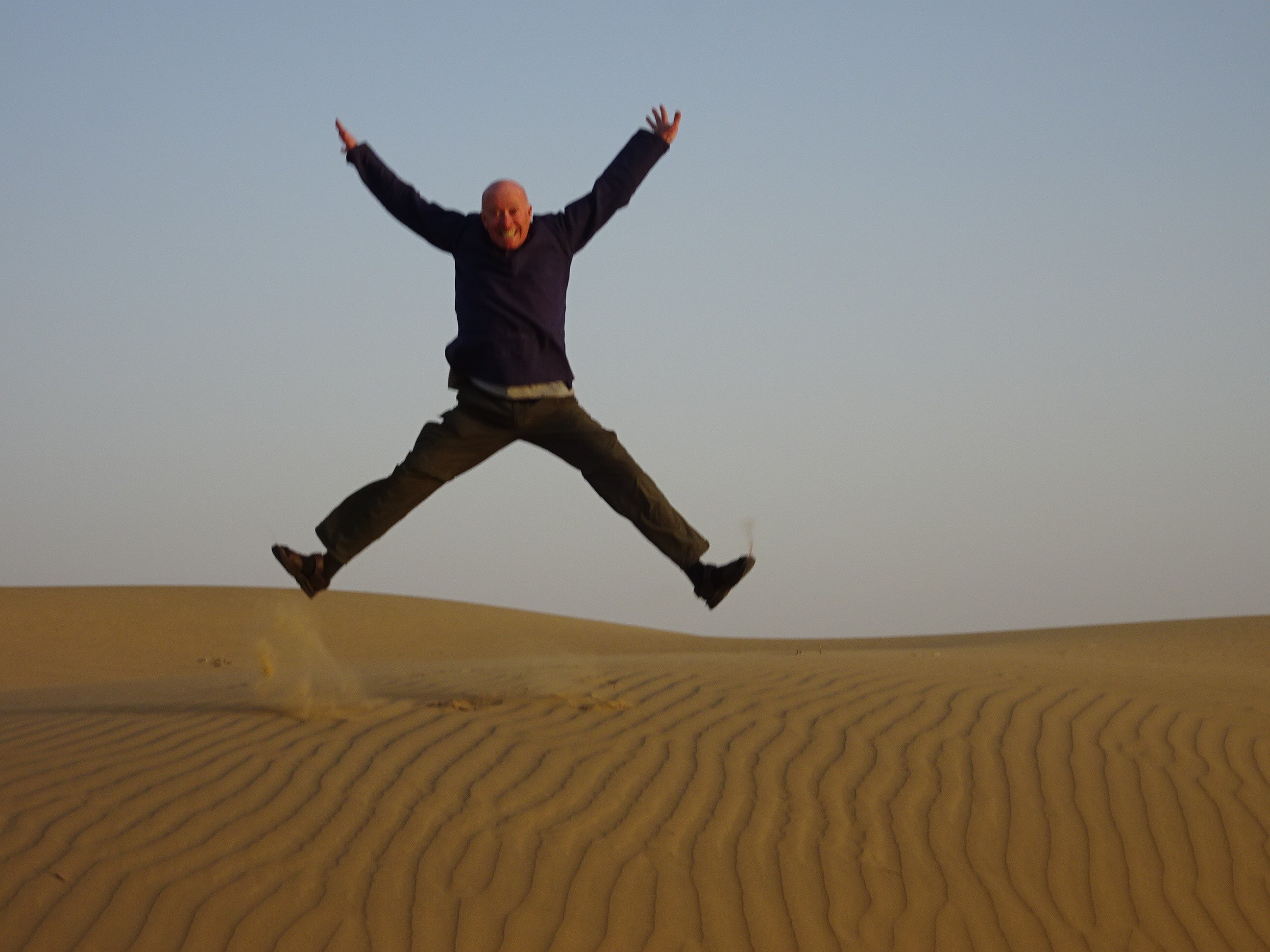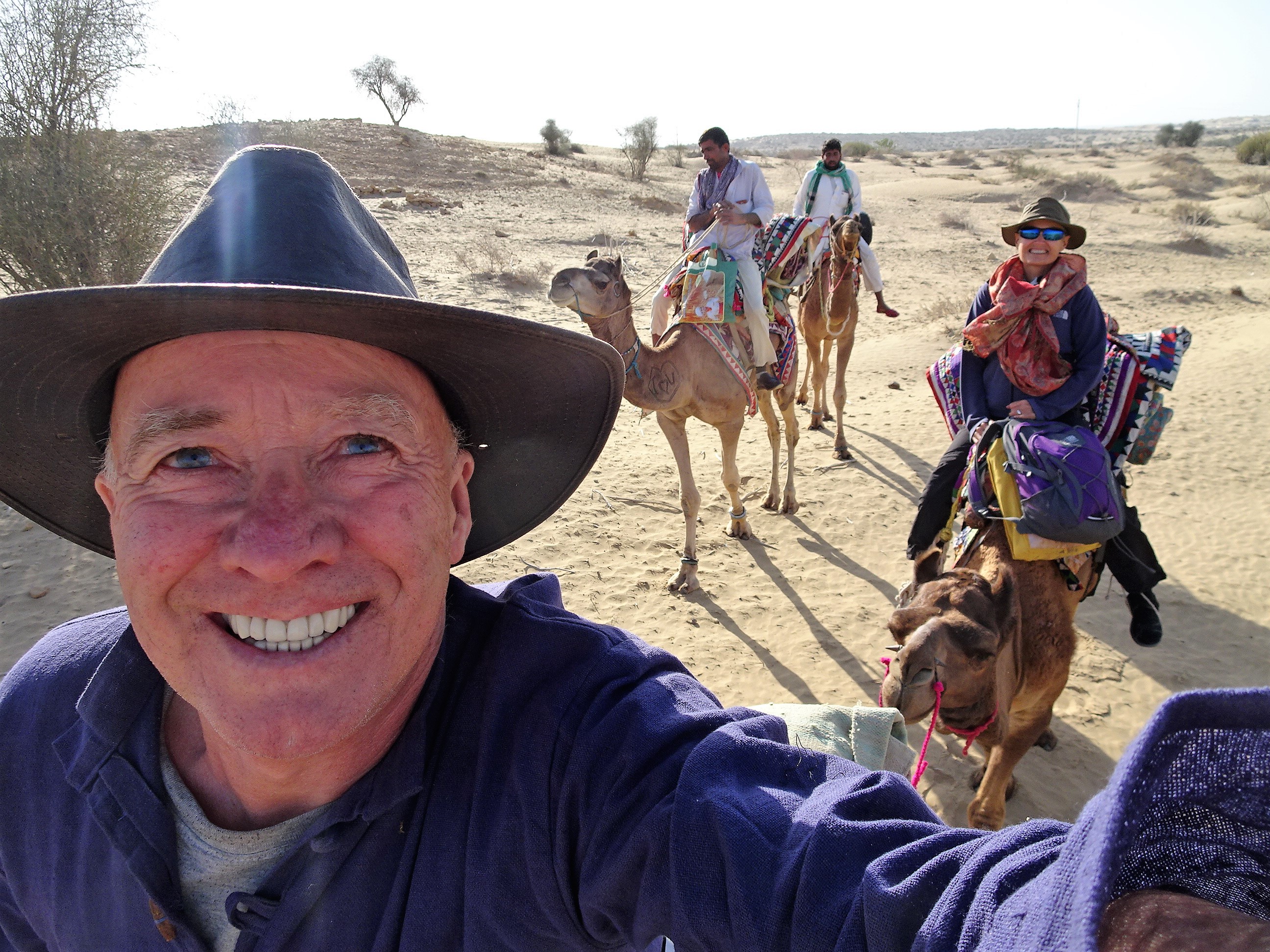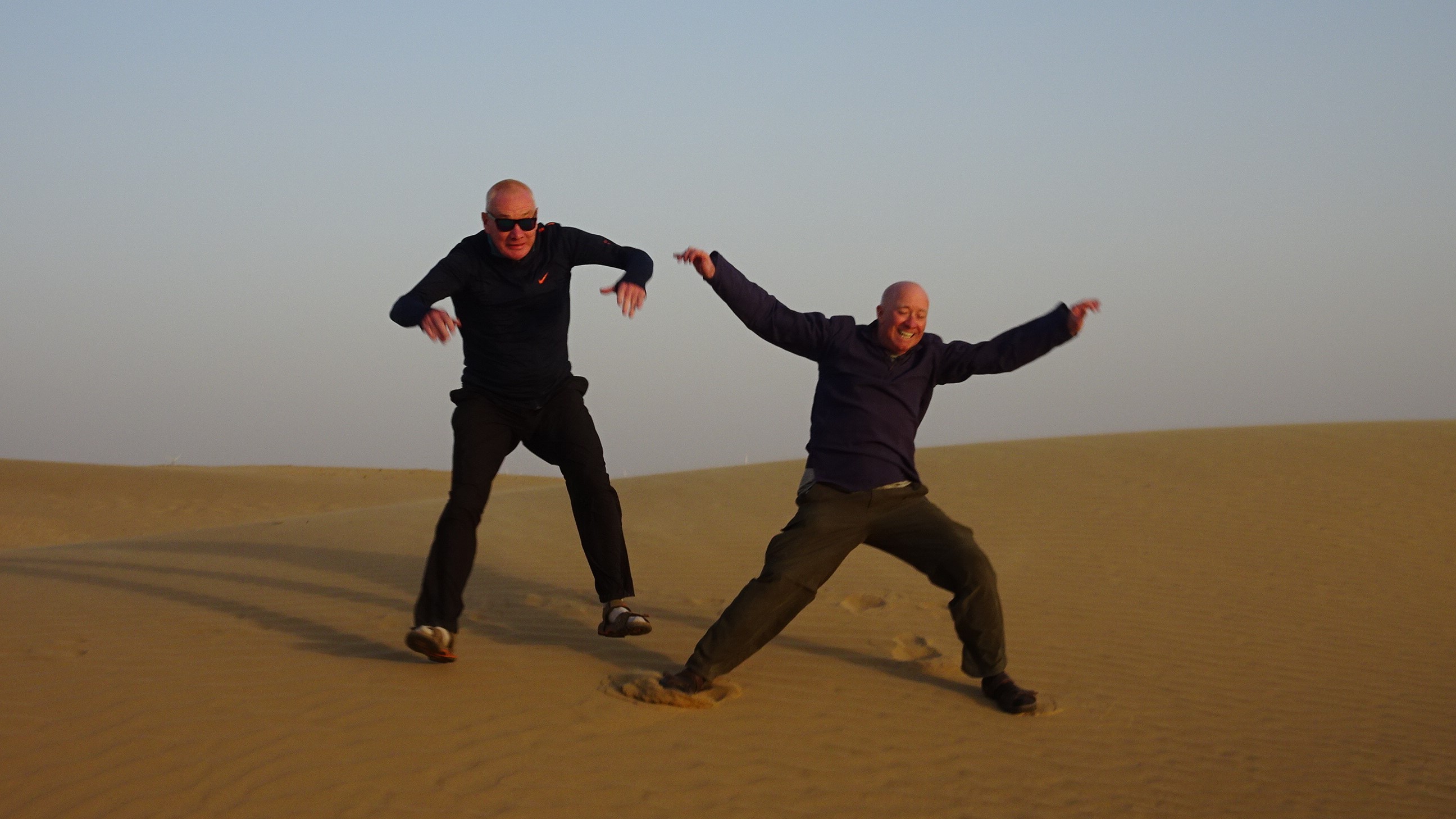 We rode again for another couple of hours and finally got to the dunes where we played like kids in the sand before watching the sunset. The two largest camels had been making the strangest noises throwing out their tongues, blowing raspberries and foaming at the mouth. Mr Khan explained it was getting towards the end of mating season and these two were getting horny if they could sniff any females nearby. Neil noticed that they peed backwards so asked the camel men how they were able to shag whilst thrusting his hips forward to demonstrate. They giggled like girls at his question and his mime! He was then taken to a camel by the eldest one who explained by pointing closely and touching, they had a lot of dangling skin which directed the pee backwards but when they got excited they would be able to thrust forward. He then grinned and rushed off quiclkly to wash his hands.