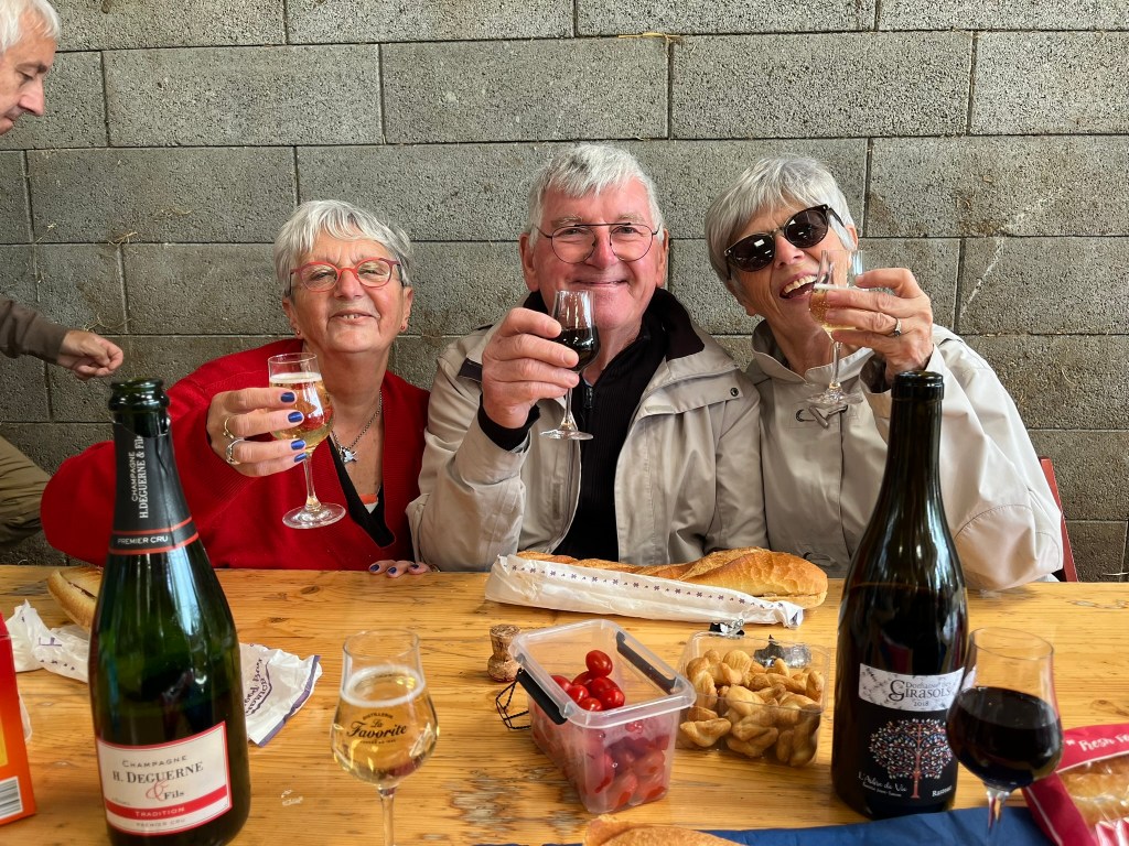 After the tour we returned to the party as they were about to sit down for dinner.  It was nearly 9pm and J-P recognised that we were now struggling so asked us if we would like to travel home, we did!  It had been a truly momentous day with unbelievable hospitality shown to us by complete strangers.  Back at the house we had a supper of charcuterie, J-P opened red wine for himself and Calvados for Neil.  Cheryl talked about Francoise Hardy, a famous French singer who had died recently and Chantal played some of her music and she sang along really beautifully.   It had been an amazing day.
