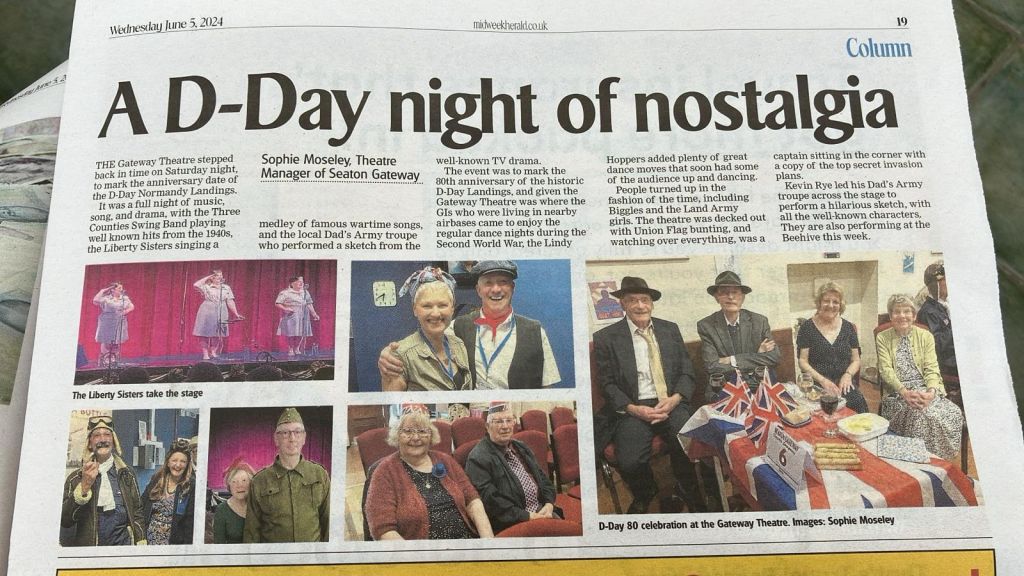 In Seaton we’ve been volunteering in Tourist Information and at The Gateway.  We had tributes to Madness and Nina Simone both of which were excellent and allowed us have fun behind the bar.  It’s especially good when the theme is the 80th Anniversary of the D-Day Landings.  Many people dressed up and no surprises that we did our bit and ended up in the local newspaper.