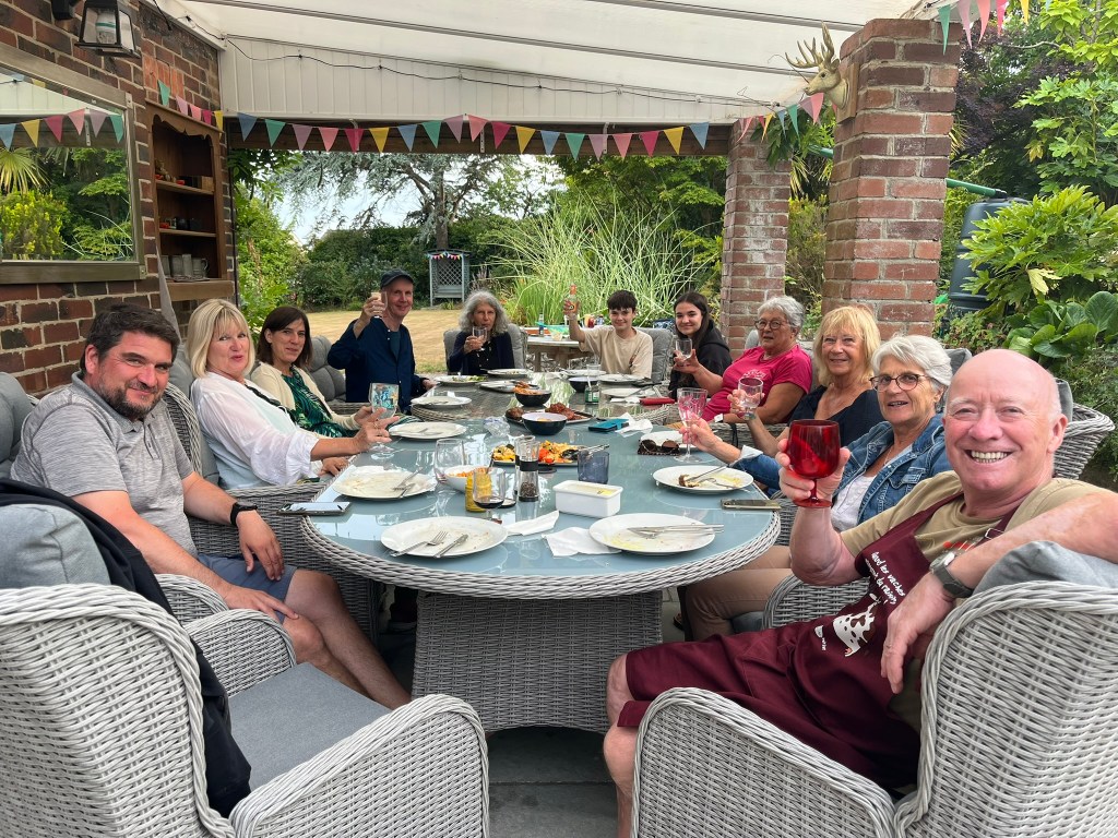 We’ve settled into the usual summer routine of eating, drinking and having fun with family and friends. We celebrated Pat and Don’s 40th wedding anniversary with drinks and snacks outdoors in their gorgeous garden with the rest of The Social Club. We keep thanking our lucky stars that we have such sociable neighbours that love to laugh at themselves as well as each other. We also have a new venue for our mission to keep the local bars and restaurants in business by frequenting them as much as possible. The Harbour in Axmouth advertised a new ‘wrinklies special carvery’ every Wednesday lunchtime for £12. Not one to miss a bargain Cheryl recruited the social club to give it a try. Well, fabulous sunshine, an amazing lunch with so many vegetables to choose from gave us another superb afternoon. Everybody agreed it was a delicious lunch, and the bonus was it was great value. All booked again for next month!