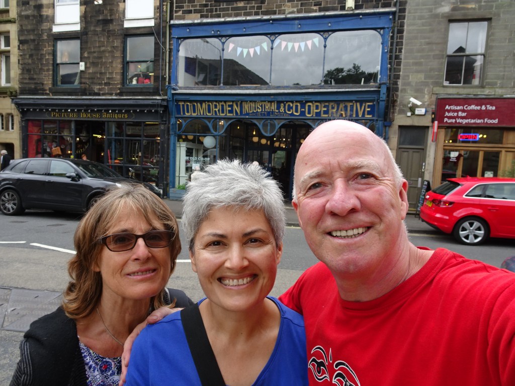 We arrived in Hebden Bridge and moored up at the quieter end of town. Neil made new friends with a party boat full of young couples out for the day, and then with Rowan the owner of the spectacular wide houseboat moored next to us. Rowan was a quite stunning lesbian and she invited Neil to have a look around. When he didn’t return for quite some time Cheryl and Gail started to wonder what was going on. Next morning we had a walk to Heptonstall which was gorgeous – there was an open studios event on so we had a peek into some of the old buildings and cottages.
