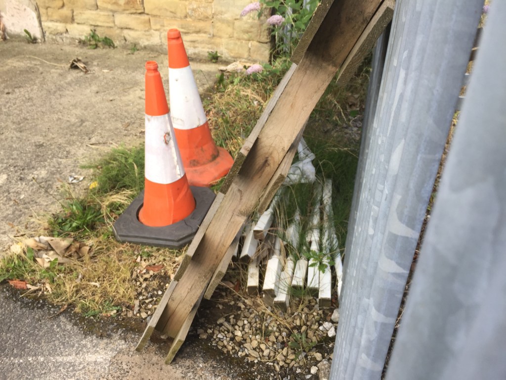 Next morning we set off and negotiated the first lock only to find that the following pound was very low. The usual remedy is to release more water from the next lock but there was a sign saying it couldn’t be accessed from the towpath. Cheryl set off to investigate and found the only way in was to climb a 6ft anti vandal fence. Aided by an old pallet and 2 traffic cones she managed to get in without impaling herself on the spikes but still couldn’t get enough water into the pound, and there was no way to get back over that fence.