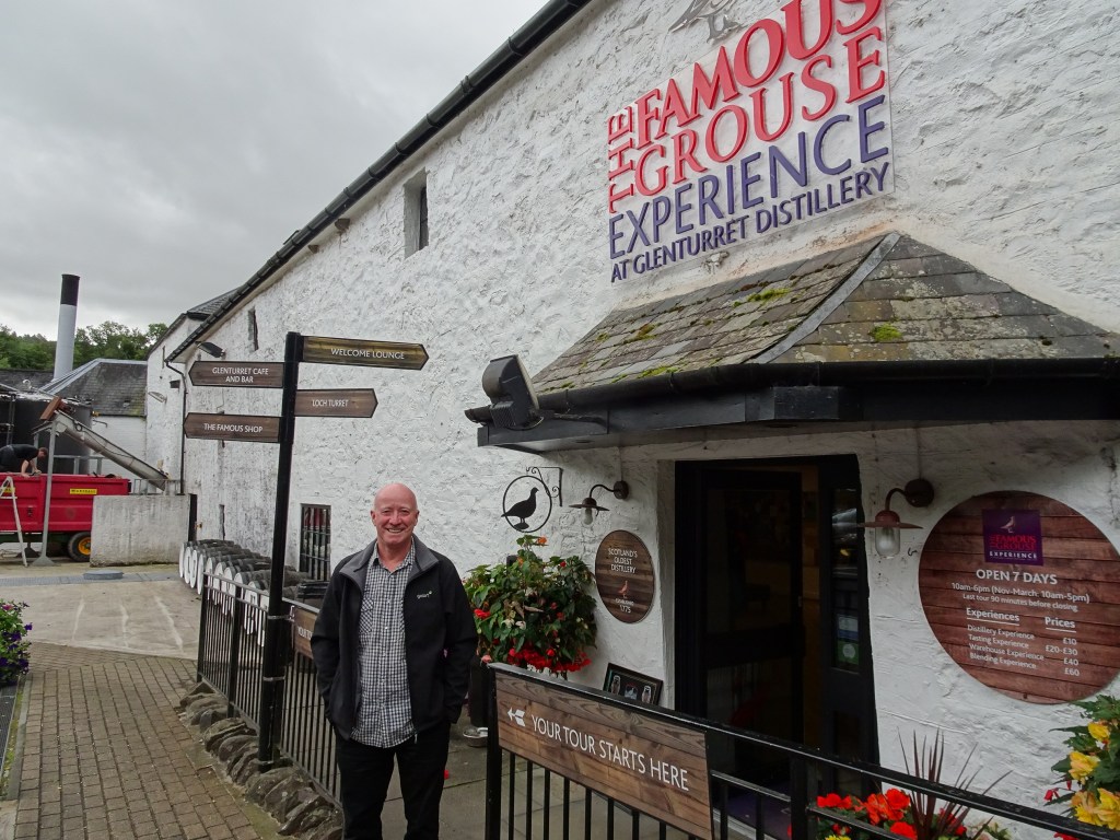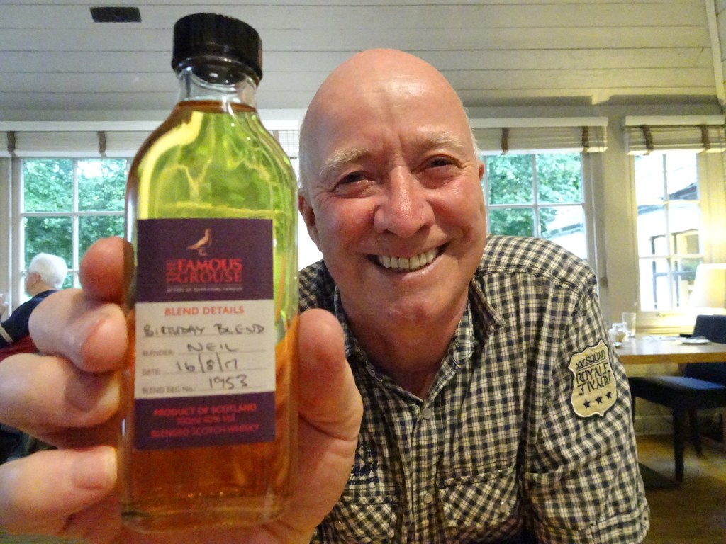 We came to Crieff with purpose – it was to celebrate Neil’s 64th birthday at the oldest distillery in Scotland, Glenturret, which is part of the group that owns Famous Grouse. We had an extremely good lunch in the restaurant before taking the 2.5hr Whisky Blending Course. It started with a tour of the distillery, then to one of the bonded warehouses where we sampled 4 different varieties of single malt with one being 65% proof! We were very surprised that the measures were good sized tots rather than just a drop in the bottom of the glass. Having had a couple of drinks whilst we chose our food at lunchtime, plus a bottle of wine with the food, we were beginning to float.