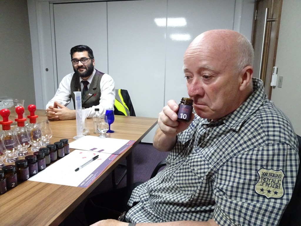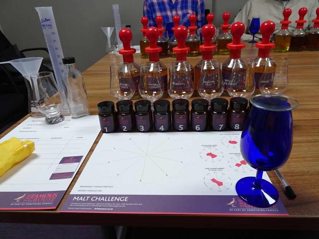 Next stop was the blending room and back to the school science lab……..ha, if only the labs at school had been stocked like this! First, we had 10 different smells in bottles that would tell us what sort of odours excited our noses. These were related to the 6 different varieties of single malt that we were to use to make our own blend and we were to take home in our own small bottle. This, of course, involved even more tasting as we went along, yippee!! We now realised what a good idea it was to travel by taxi!!