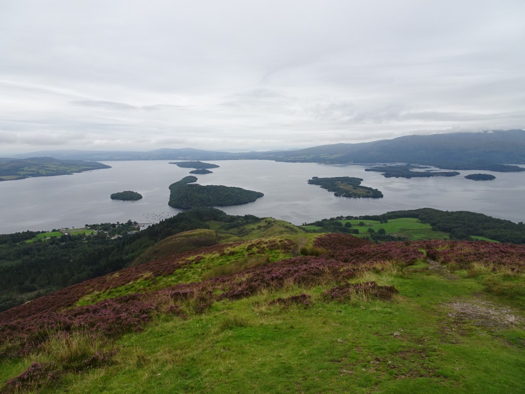 We left Crieff for our final week in Scotland on the bonnie, bonnie banks of Loch Lomond. Our simple caravan site of just 5 caravans was magnificent. We had a stunning view of the loch from the front window and the surrounding peaks at the side. What’s great about our caravan is that we can open the blinds at the front and sit in bed having our early morning cuppa just gazing at the wonderful scenery. It’s amazing just how the Scottish weather changes so dramatically and so quickly but we did have enough dry days to walk the banks of the Loch and The West Highland Way choosing a different location to start each day. This included the walk up to the top of Conic Hill where we had a magnificent view of the Loch and our wee caravan way in the distance.
