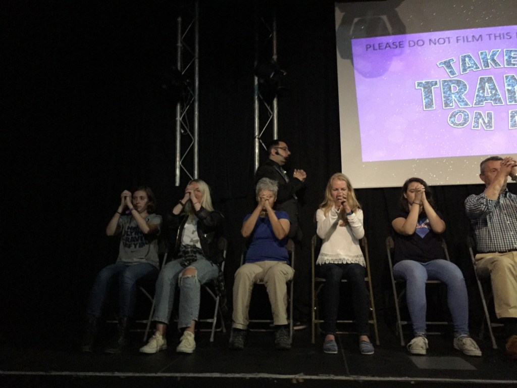What followed was just amazing. Several of the volunteers were quite clearly hypnotised whilst some were possibly faking it. They performed some really amusing antics which were ‘fun’ rather than being embarrassing. However, Cheryl just didn’t go under and after laughing and signing to Neil that ‘nothing was happening’ she was the only volunteer who was asked by Ben to leave the stage like a naughty child and told to return to her seat next to Neil……….we just sat and giggled for ages.