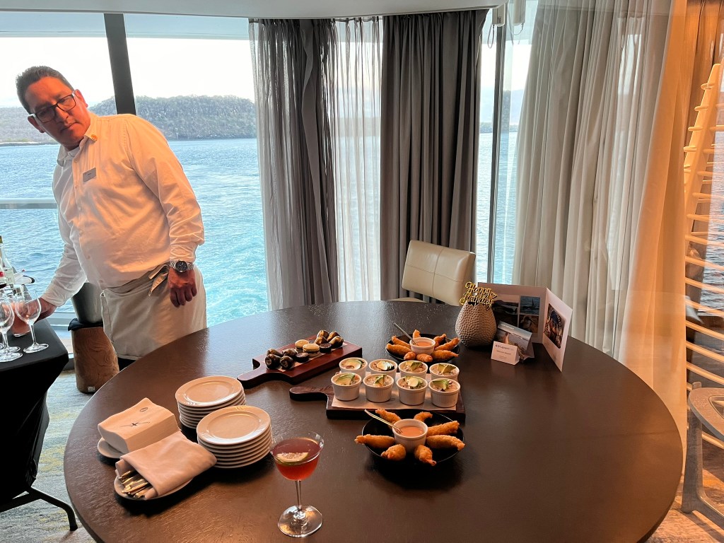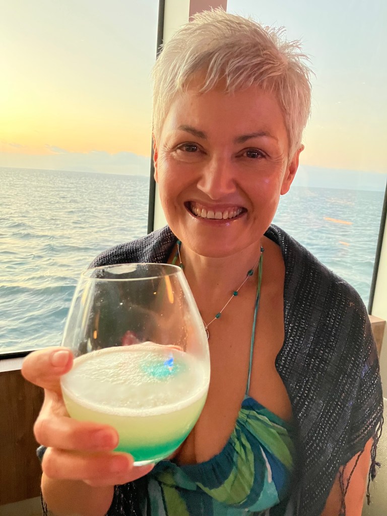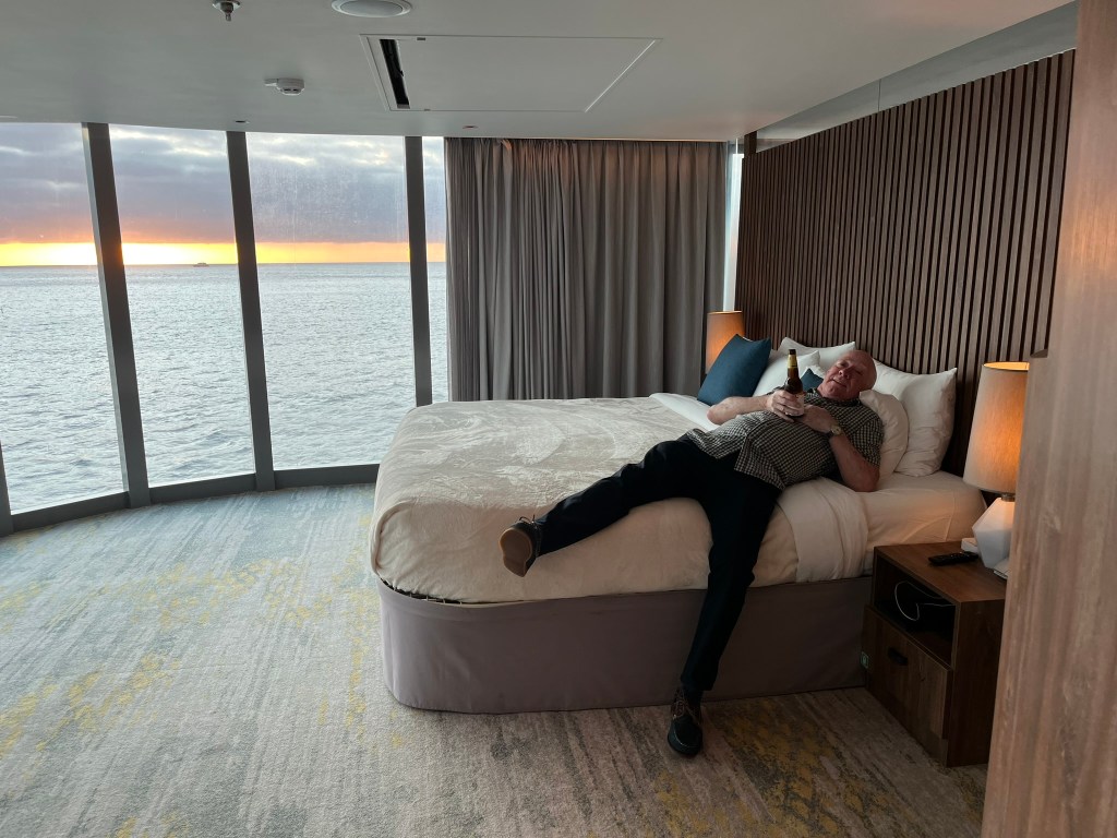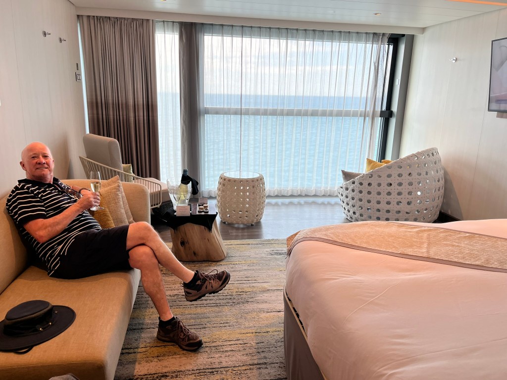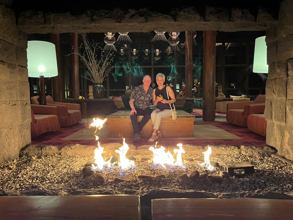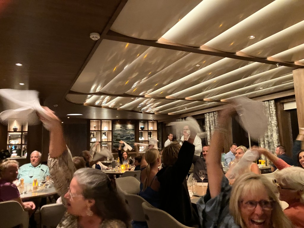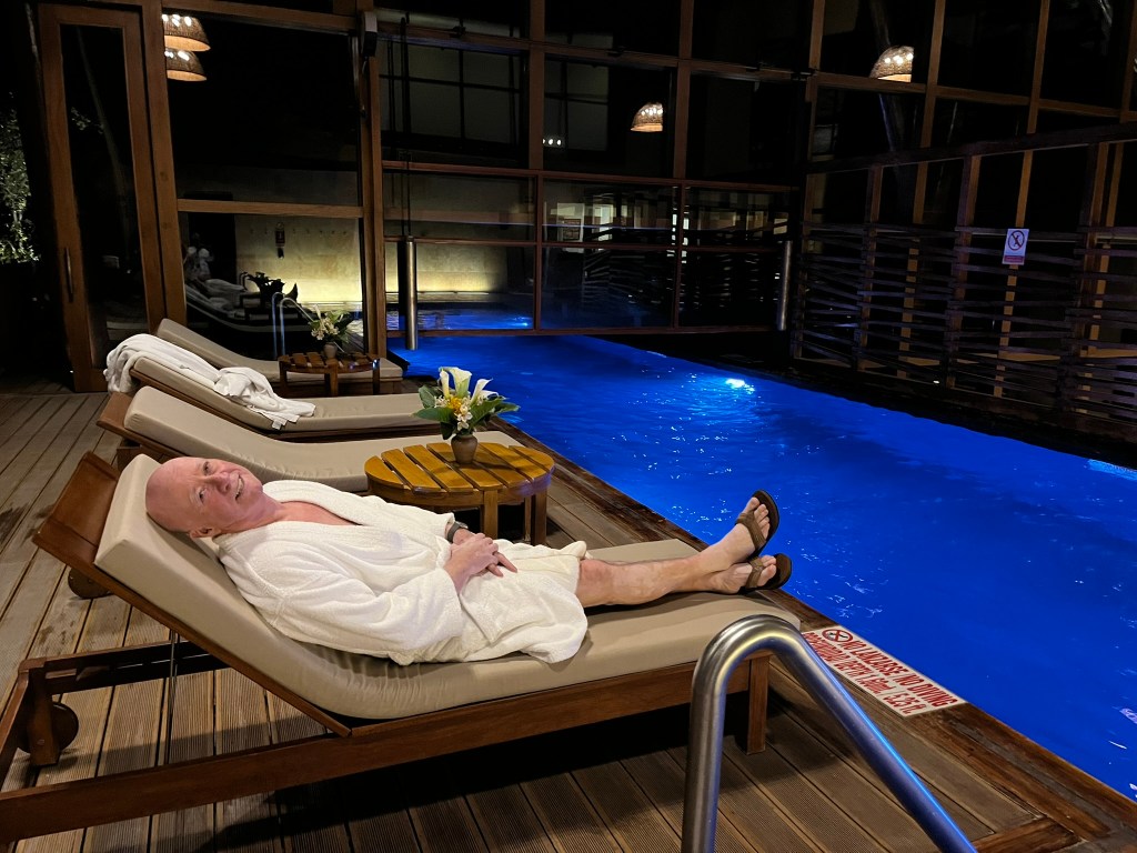 There was an interesting incident. After dinner there was usually some low key entertainment laid on in the bar. One night it was a music quiz with extra points on offer for those teams who got up and danced appropriately. It was the usual stuff, Macarena, YMCA etc. Regular readers will know that we can get quite competitive and that night was no exception. It was all going well until they played ‘Let’s Twist Again’ We leapt up while fellow team members wrote down the tune plus artist and started twisting. Unfortunately as Cheryl was challenging Neil to twist lower and lower he over balanced backwards and his razor sharp glutes crashed into the glass sides of the bar – and let’s just say the bar came off worst – oops!